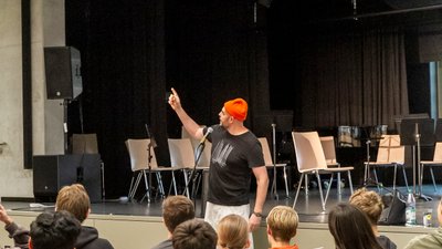 Für unsere Schülerinnen und Schüler des Jahrgangs 10 wurde die Aula für einen Vormittag zur Poetry-Bühne: Der international bekannte Poetry-Slammer Bas Böttcher war zu Gast – und brachte mit seinem Programm „Verkuppelte Worte“ die Sprache zum Klingen.