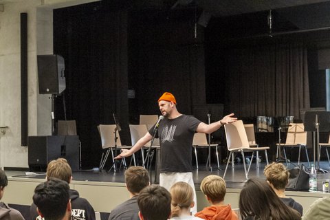 Für unsere Schülerinnen und Schüler des Jahrgangs 10 wurde die Aula für einen Vormittag zur Poetry-Bühne: Der international bekannte Poetry-Slammer Bas Böttcher war zu Gast – und brachte mit seinem Programm „Verkuppelte Worte“ die Sprache zum Klingen.