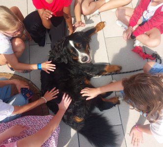 Auch Schulhund Una schaute vorbei, ließ sich streicheln und genoss sogar einen Spaziergang in der Pause – ein echtes Highlight für viele Kinder.