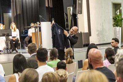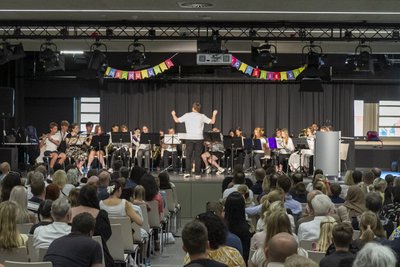 Bei herrlichem Sonnenschein begann die Einschulungsfeier auf dem Schulhof: Dort erhielten alle Kinder von ihren neuen Lehrerteams erst einmal ein buntes Armband, das ihnen den Weg in ihre neue Klasse wies und zugleich ein erstes Zeichen der Gemeinschaft setzte. Anschließend ging es weiter in die festlich geschmückte Aula, wo sich die zahlreichen Familien voller Vorfreude und Aufregung versammelten. Das Schulorchester eröffnete die Feierlichkeiten schwungvoll und hieß die neuen Fünftklässlerinnen und Fünftklässler sowie ihre Familien musikalisch willkommen. Unser Schulleiter Herr Markus Herget begrüßte alle Anwesenden mit herzlichen Worten. Stolz blickte er auf die inzwischen stattlich gewachsene Schule und stellte als Symbol der Gemeinschaft den neuen IGS-Pulli vor. Damit machte er deutlich: Von nun an gehören die neuen Kinder fest zu unserer Schulgemeinde. Nach der Ansprache des Schulleiters fanden sich die Klassen zusammen und besuchten zum ersten Mal ihren neuen Klassenraum – ein aufregender Moment für die Kinder, die damit ein Stück mehr „angekommen“ waren.