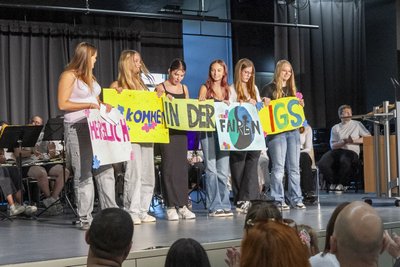 Besonders freute sich die Schulgemeinde, dass diese Einschulung die erste im neuen Gebäude war. 155 neue Schülerinnen und Schüler wurden aufgenommen – verteilt auf sieben Klassen, darunter gleich zwei Sportklassen, da die Nachfrage in diesem Bereich besonders groß war. Die Stimmen der Familien zeigten, wie vielfältig die Vorfreude ist: „Das passt richtig gut zu unserem sportlichen Kind!“, freute sich Familie Maiwald. Viele Eltern, die selbst einmal an der IGS waren, geben nun ihre eigenen Kinder in vertraute Hände: „Ein paar Lehrer kennen wir sogar noch. Herrn Biersack zum Beispiel“, berichteten zwei Väter lachend. Familie Braun erinnerte sich ebenfalls an die eigene Schulzeit und betonte, dass sich die Tochter bereits beim Tag der offenen Tür sofort wohlgefühlt habe. „Die Atmosphäre ist familiär und entspannt, und dass jede Klasse gleich mit zwei Klassenlehrern startet, finden wir sehr überzeugend.“ Familie Meier zeigte sich begeistert vom AG-Programm. Die Tochter freut sich schon auf die Bienen-AG. Auch Frau Lohmann schließlich gab ihre Tochter mit einem guten Gefühl an die IGS: Ihr älterer Sohn besucht bereits erfolgreich die Schule und beide Kinder haben das Ziel, hier das Abitur zu erreichen.
