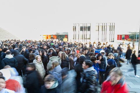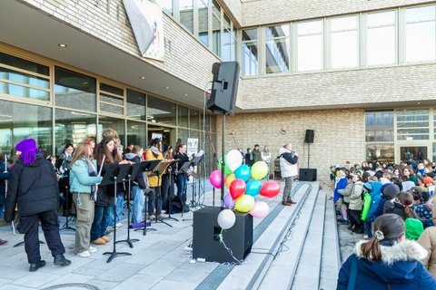 Mit musikalischer Begleitung durch das Schulorchester „Sound of Stierstadt“ unter der Leitung von Timo Ratz, das „Pomp and Circumstance“ von Edward Elgar spielte, begann die Zeremonie. Alle Schülerinnen und Schüler der IGS versammelten sich vor dem neuen Gebäude, Jahrgang 5 stand ganz vorne gefolgt von den höheren Jahrgängen. Dann kam der große Moment: Gemeinsam zählte die ganze Schülerschaft lautstark den Countdown herunter – und bei Null entrollten entrollten die Schülerinnen Vianne Seidenthal und Merle Güttler aus der Q1 feierlich das Banner vom Bürofenster der Schulleitung, – ein symbolischer Moment für den Aufbruch in eine neue Ära. Begleitet von aufsteigenden Seifenblasen und begeistertem Jubel ging eine spürbare Gänsehautstimmung durch die Menge.