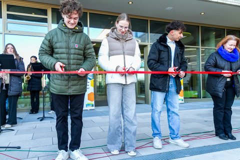 Einer der Höhepunkte war das feierliche Durchschneiden des roten Bandes durch eine Gruppe aus Schulleitung, Schülervertretung und Lehrkräften. Damit war das neue Gebäude offiziell eröffnet! Im Anschluss erklang „A Million Dreams“ aus dem Film The Greatest Showman, gespielt von „Sound of Stierstadt“ – ein musikalischer Ausdruck unserer Zukunftsvisionen und Träume.