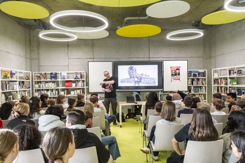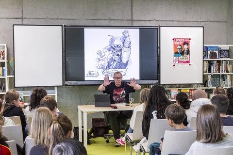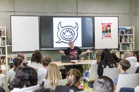 Der Auftakt des diesjährigen Lesefestivals an unserer Schule stand ganz im Zeichen von Humor, Fantasie und jeder Menge Lesefreude. Zu Gast war der bekannte Jugendbuchautor Jochen Till, der mit seinen fantastischen Geschichten Kinder und Jugendliche gleichermaßen begeistert. Im Mittelpunkt seiner Lesung stand die erfolgreiche Buchreihe „Luzifer Junior“ – der Sohn des Teufels, der lernen muss, wie das Leben unter Menschen funktioniert. Mit Witz, Charme und den herrlichen Zeichnungen von Raimund Frey nahm Jochen Till sein Publikum mit in die skurrile Welt zwischen Hölle und Schulhof „Besonders die lustigen Bestrafungen des Teufels fand ich toll – Schneeflocken zählen oder Höllenhundkacke aufsammeln!“, lacht eine Schülerin begeistert. Schnell wurde klar: Jochen Till versteht es meisterhaft, Kinder mit Humor und Fantasie fürs Lesen zu gewinnen. In der anschließenden Fragerunde zeigte sich der Autor offen und nahbar. Auf die Frage, warum er Lesungen halte, antwortete er: „Wenn ich durch meine Lesungen Kinder zum Lesen anregen kann – und sei es nur ein Kind pro Klasse – freut mich das riesig!“ Viele Schülerinnen und Schüler entdecken durch seine Bücher den Einstieg in die Welt der Fantasie und Abenteuer. Schon im letzten Jahr lasen Teilnehmende des Vorlesewettbewerbs aus seinen Werken – ein Zeichen, wie stark seine Geschichten nachwirken. „Ich will mal alle seine Bücher lesen!“, schwärmt ein Schüler und notiert sich eifrig die Titel, bevor er in die Pause rennt. Wenn das kein Beweis dafür ist, dass Autorenlesungen inspirieren!