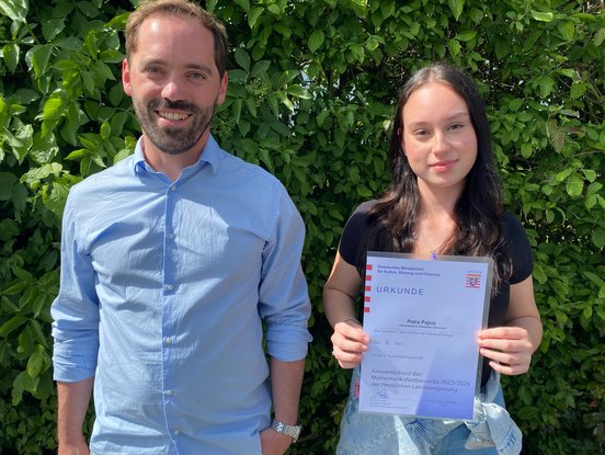 Petra Pajcic und Mathelehrer Hr. Meisinger nach der Übergabe der Urkunde in Aßlar