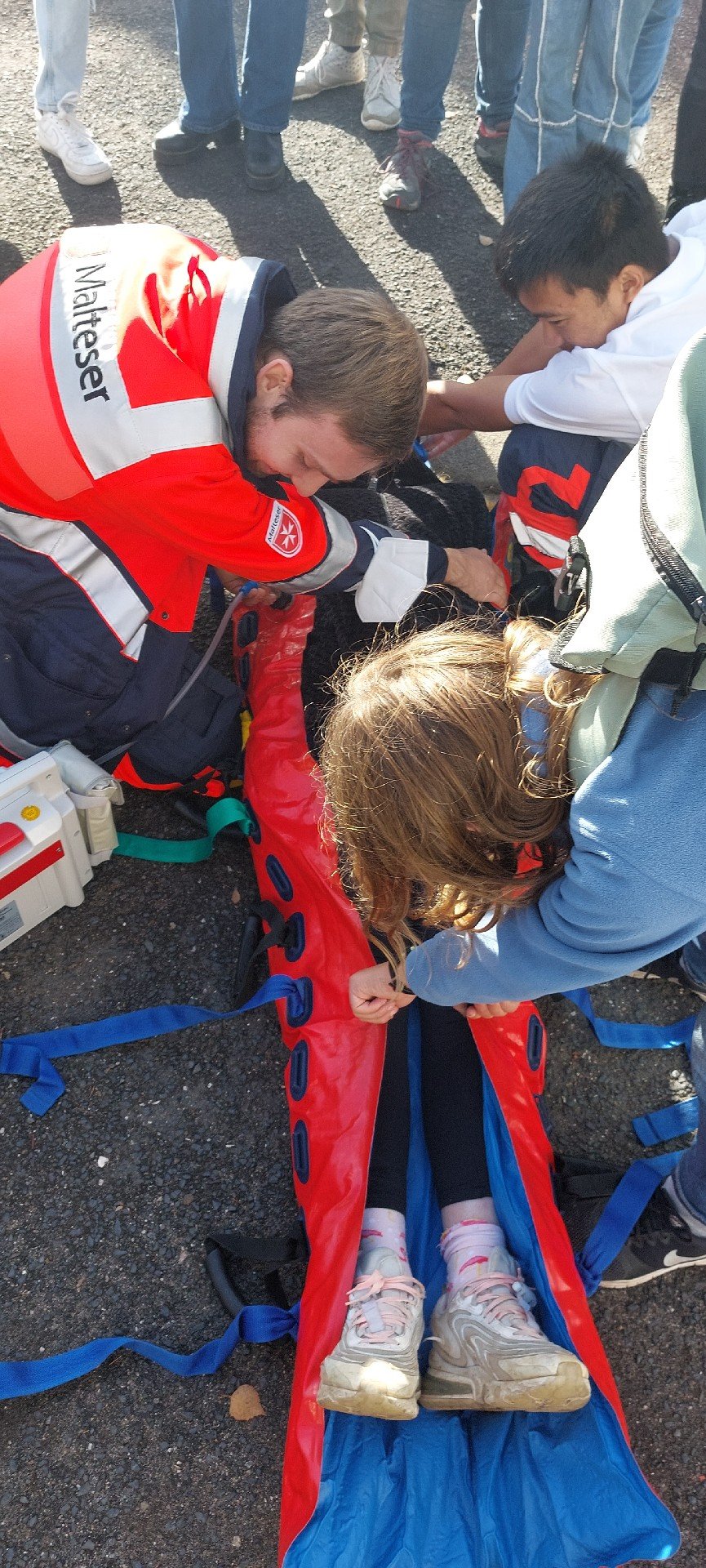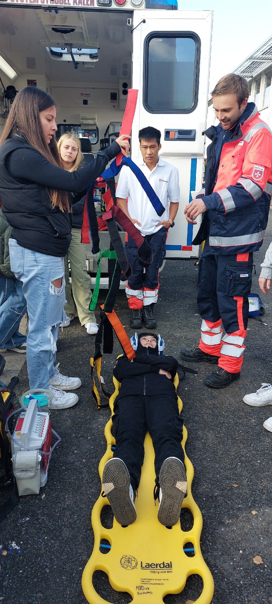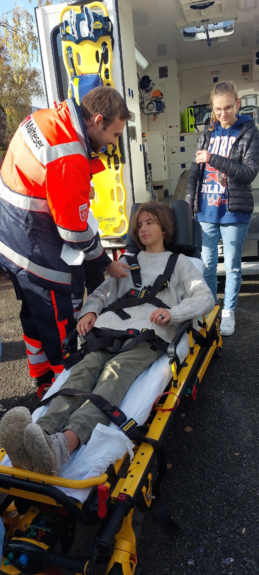In Kooperation mit den Maltesern Bad Homburg erhielten die SchulsanitäterInnen der IGS Stierstadt Einblick in das Leben von RettungssanitäterInnen und eine Führung durch den Rettungswagen (RTW). Notruf absetzen, Erste Hilfe Maßnahmen durchführen, Ruhe bewahren, Rettungswagen einweisen und den Notfall zu übergeben sind Tätigkeiten, die unseren SchulsanitäterInnen schon vertraut sind und oft in Zusammenarbeit mit RettungssantitäterInnen erfolgen. Heute ergab sich die Möglichkeit, einen Rettungswagen, ohne den Einsatzstress anzuschauen und sich auch mal als PatientIn „abtransportieren“ zu lassen.