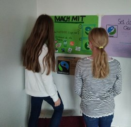 Auf dem Foto stehen zwei Schülerinnen der Fairtrade AG vor ihrem Plakat. Jeden Donnerstag in der 7. und 8. Stunde trifft sich die AG mit Ute Gerhold-Roller. Unermüdlich überlegen sie neue Quizfragen und haben eine Menge Spaß dabei.
