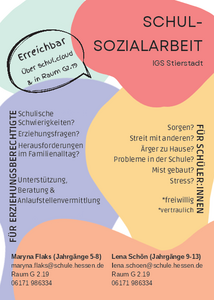 Seit einigen Jahren ist die Schulsozialarbeit ein fester Bestandteil des Schullebens an der Integrierten Gesamtschule Stierstadt. Dipl.-Sozialpädagogin Frau Maryna Flaks bietet ein Beratungs- und Unterstützungsangebot für die Kinder und Jugendlichen der Schule, deren Eltern und Erziehungsberechtigte sowie für Lehrkräfte.